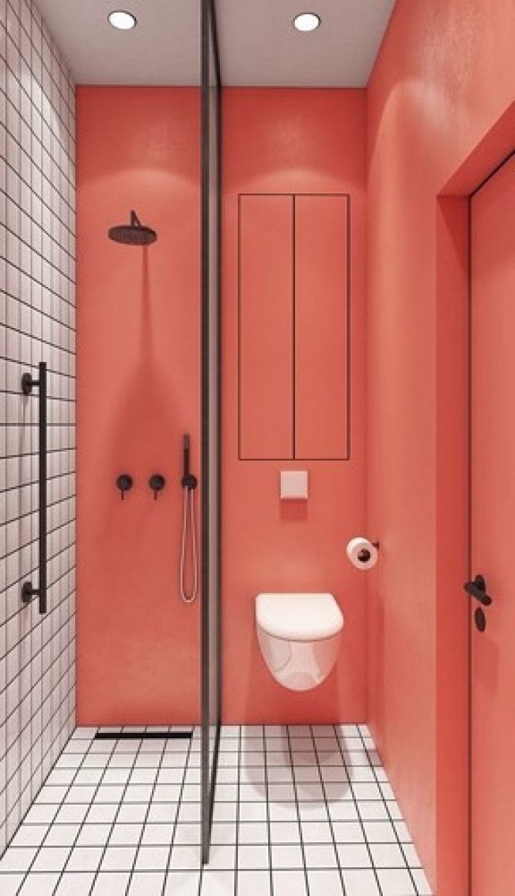 Kết hợp gạch men và sơn: Phòng tắm, nhà vệ sinh sẽ không nhàm chán, đơn điệu nếu kết hợp được những vật liệu khác nhau, mang đến một tổng thể hòa hợp. Hơn nữa, việc sử dụng những kệ gỗ trang trí giúp không gian thêm phần mới lạ.