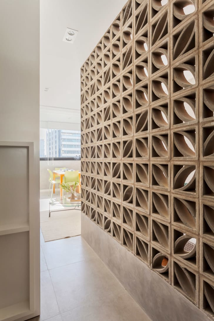 Diện tích khá hẹp, việc bố trí thêm những bức tường gạch ngăn cách không gian là điều không khả thi. Do vậy, để tạo nên sự ngăn cách cần thiết giữa các không gian, kiến trúc sư đã dựng một bức tường lỗ ở giữa khu vực giường ngủ và phòng tắm.