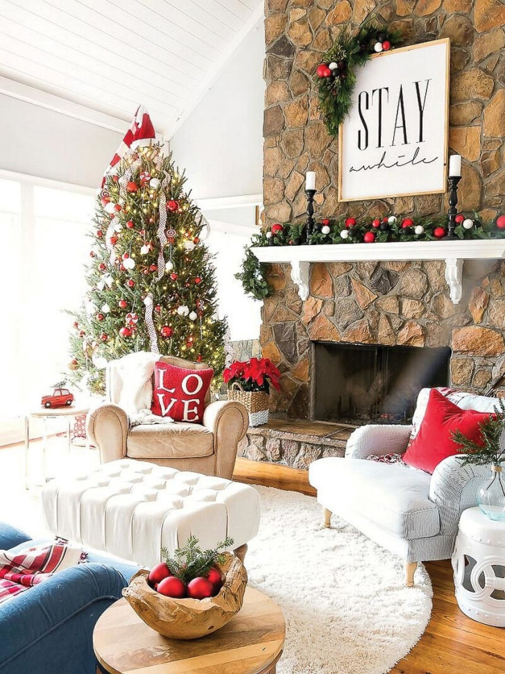 Màu đỏ là sự lựa chọn đầu tiên mỗi dịp Giáng sinh về. Làm mới phòng khách với một bức tường màu đỏ ấm áp hoặc bộ ghế sofa bằng vải lanh kết hợp với đồ nội thất bằng gỗ mộc mạc mang lại nét đẹp cổ điển cho căn phòng. Thêm điểm nhấn xung quanh với gối, khăn và phụ kiện có màu đỏ, phòng khách của bạn sẽ ngập tràn không khí Giáng sinh và năm mới.