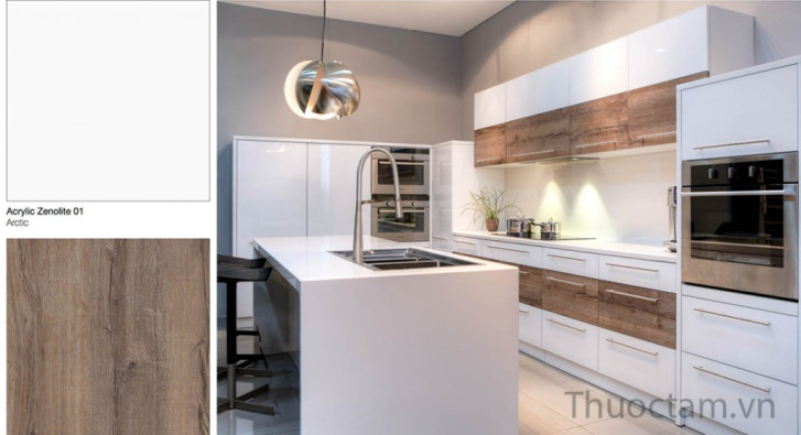 Tủ bếp hiện đại với sự kết hợp MFC kháng ẩm vân gỗ và cánh Acrylic trắng.