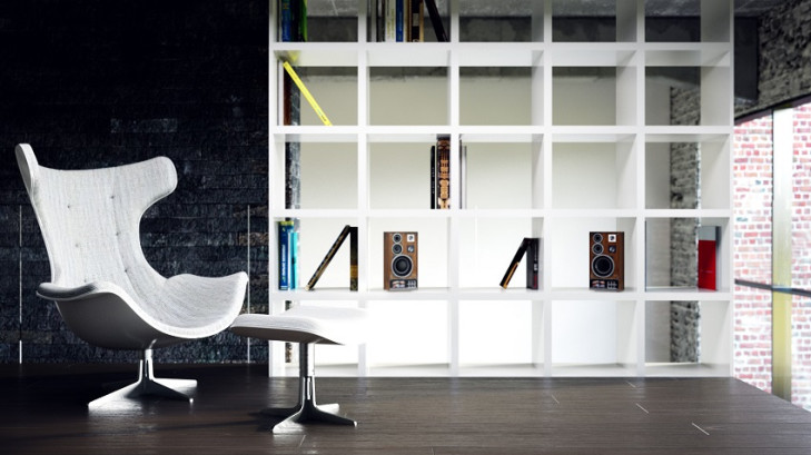 Chiếc ghế trứng (Egg Chair) màu xám hiện đại được đặt phía trước một tủ sách được thiết kế theo kiểu mạng lưới để tạo ra sự kịch tính.