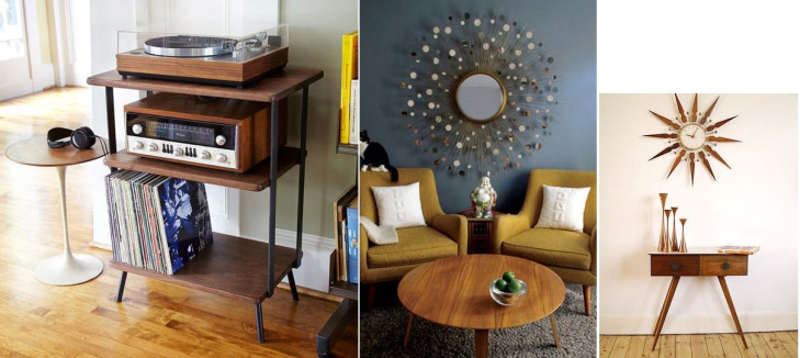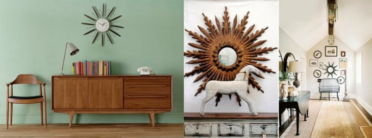 Sự nổi tiếng của thập niên 60 gắn liền với chiếc gương mặt trời cùng với đồng hồ gỗ sẽ giúp bức tường của bạn nổi bậc với phong cách Retro. Ngày nay, không khó để mua sắm đồ trang trí secondhand, những chiếc hộp kim loại kiểu vintage, đồ thủ công đặc sắc theo phong cách Retro… bạn có thể dễ dàng qua mạng hoặc các cửa hàng đồ cũ. Chỉ cần bỏ chút thời gian để nghiên cứu và săn hàng bạn sẽ có những món hàng độc đáo với giá cả phải chăng để bổ sung cho không gian nội thất Retro của mình.