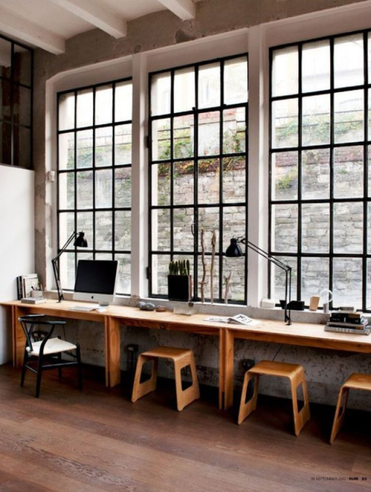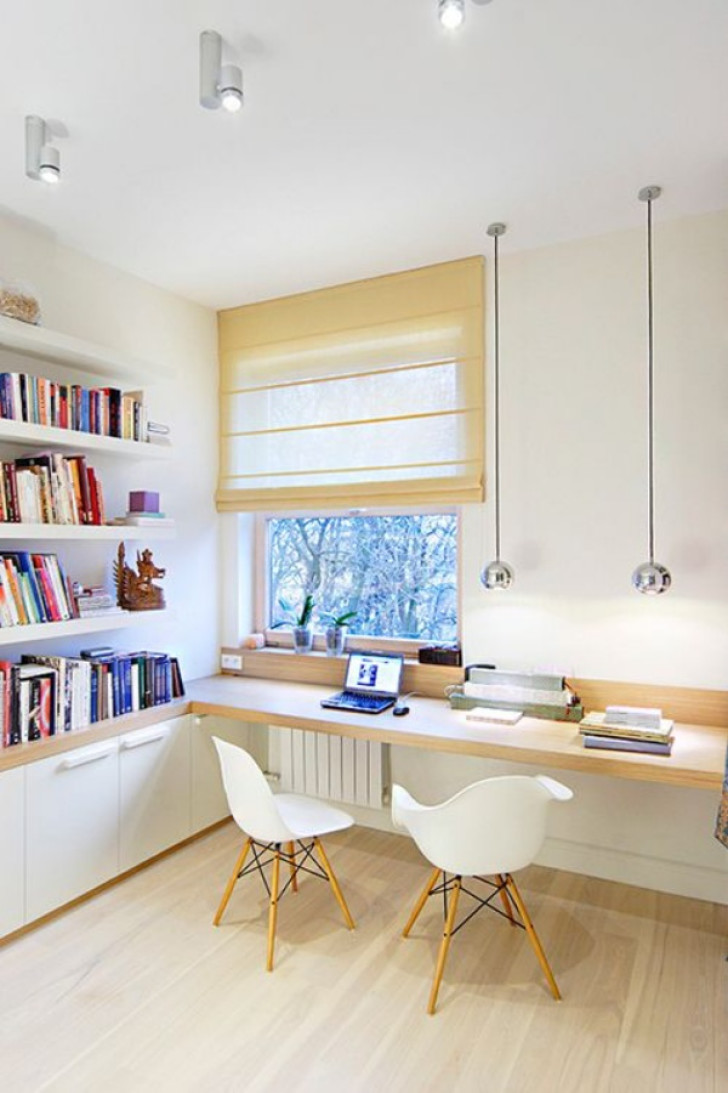 Thiết kế góc làm việc trong không gian nhà nhỏ với nhu cầu làm việc lớn hơn 1 người với khung cửa sổ nhỏ là điều hoàn toàn có thể thực hiện được với cách tận dụng khéo léo gắn bàn lên phần tường sát cửa. Để tăng ánh sáng cho bàn làm việc bạn trang trí thêm 2 chiếc bóng đèn để đáp ứng nhu cầu này.