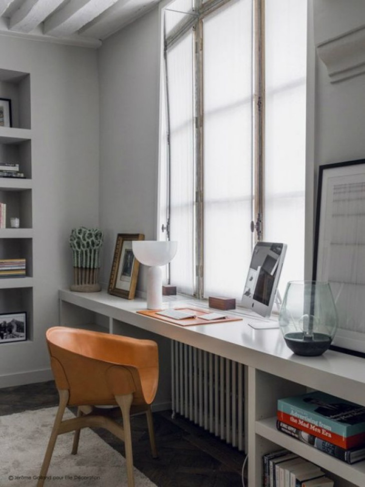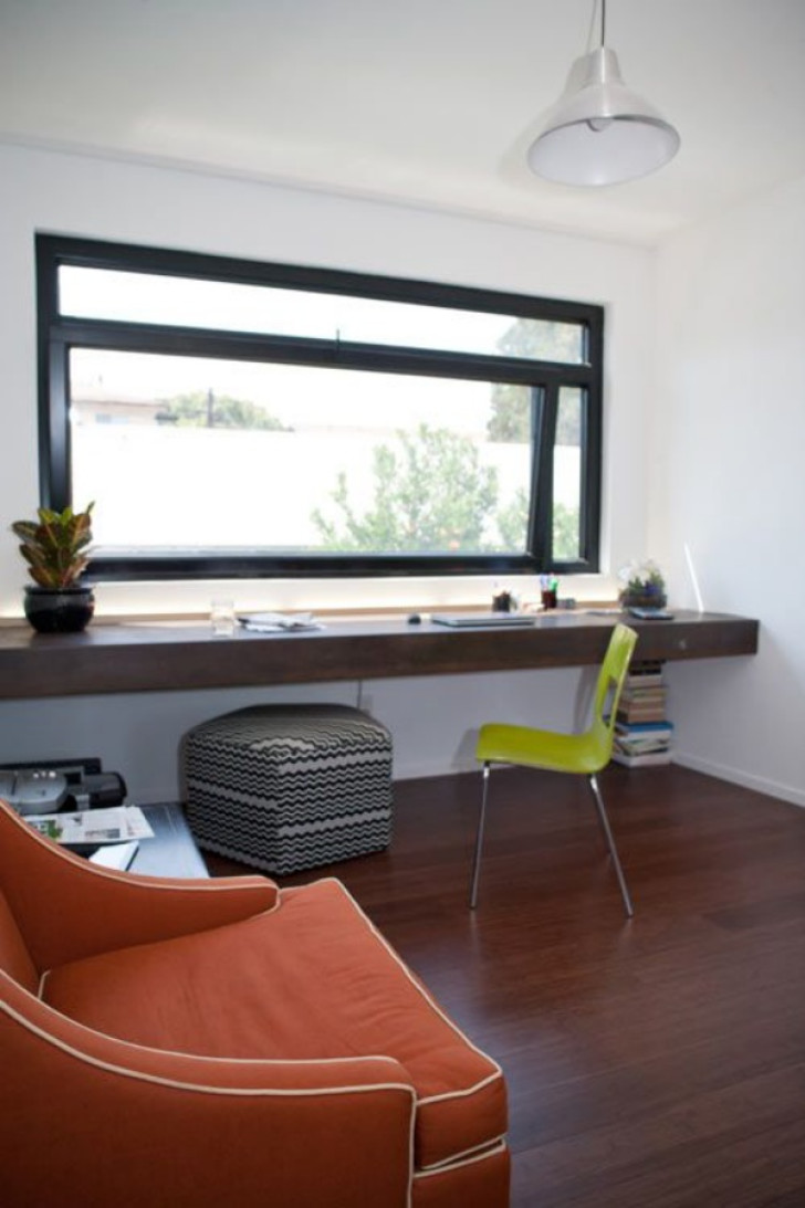 Bàn làm việc gắn liền với cửa sổ là một ý tưởng tuyệt vời cho những ngôi nhà có không gian nhỏ hẹp, thêm một chiếc ghế êm ái giúp gia chủ tận hưởng những giây phút thoải mái nhất để có thể minh mẫn giải quyết các công việc một cách ổn thỏa tại nhà.
