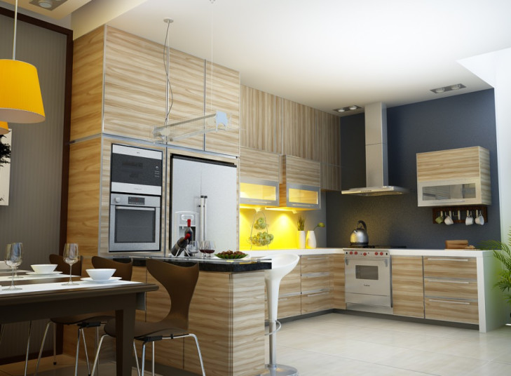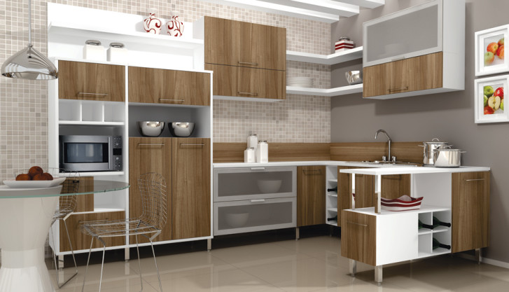 Tủ bếp hiện đại sử dụng chất liệu MFC kháng ẩm, sự kết hợp màu vân gỗ và màu trắng tạo nên sự sang trọng và hiện đại.