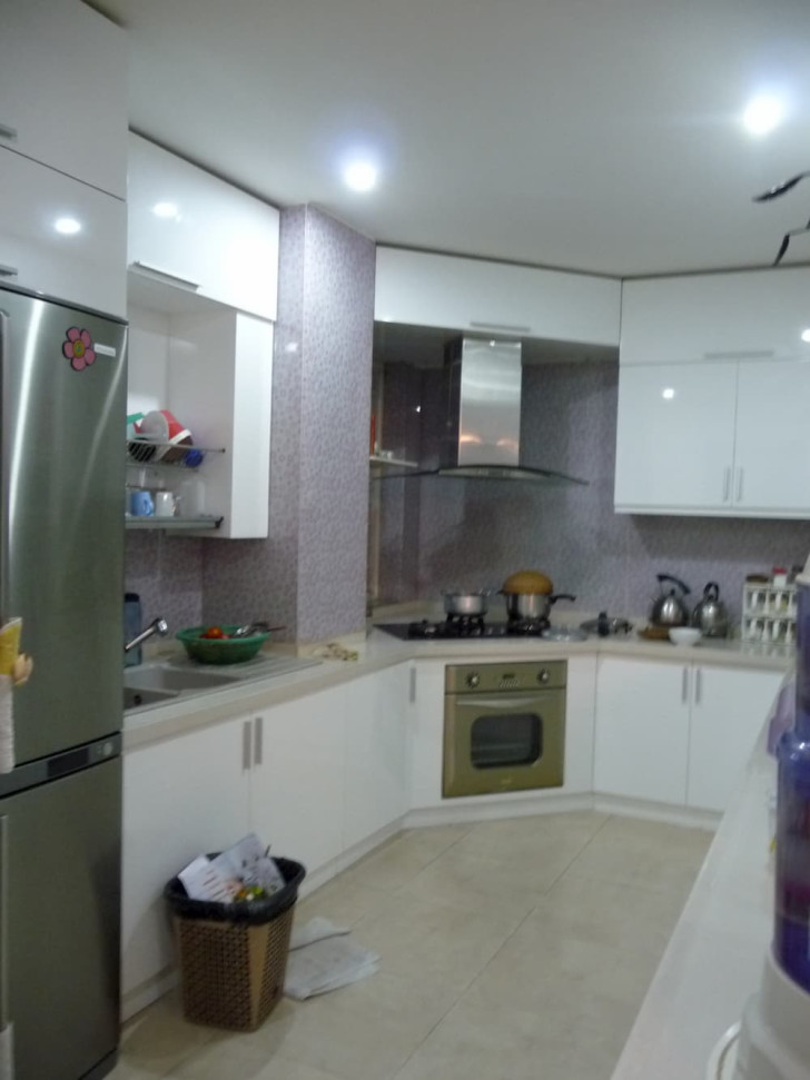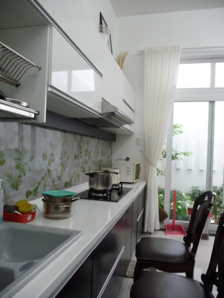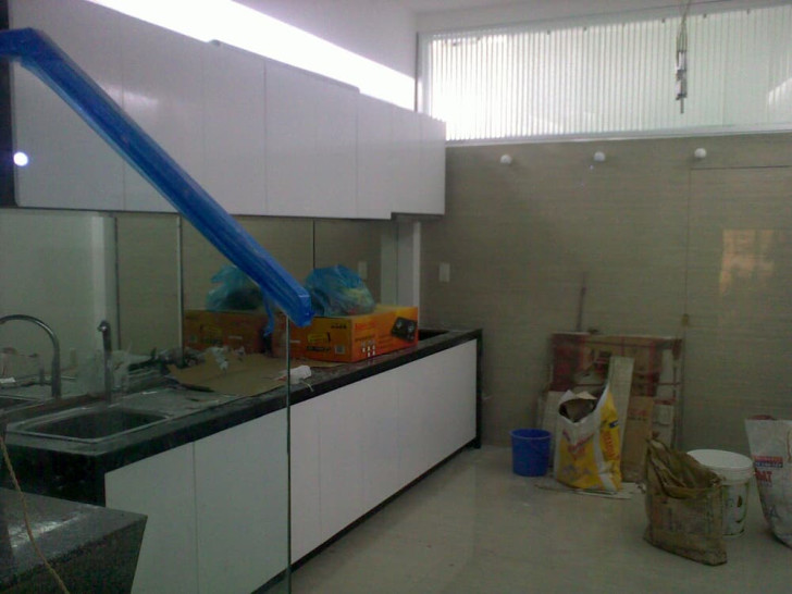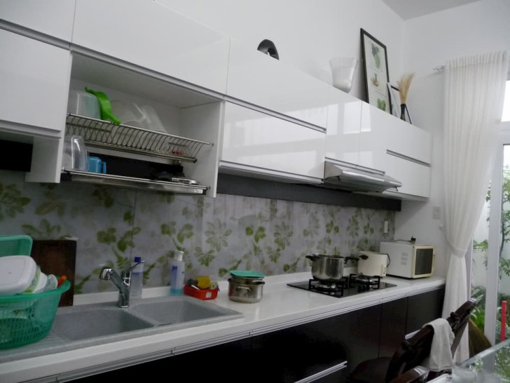 Không gian bếp không quá lớn, màu trắng sang trọng tinh khôi. Sử dụng vật liệu MDF lõi xanh kháng ẩm sơn trắng Acrylic.