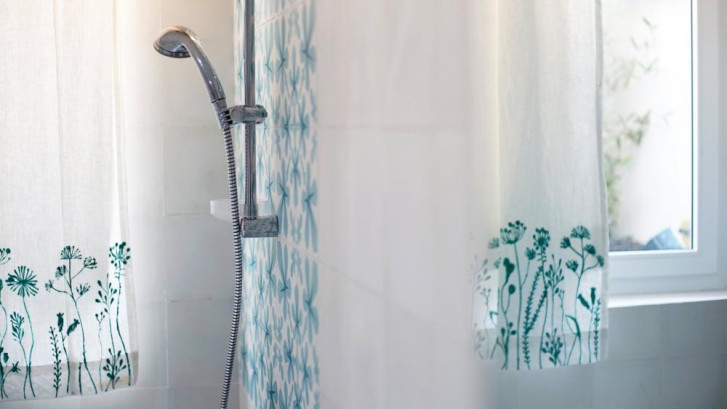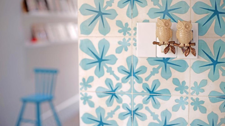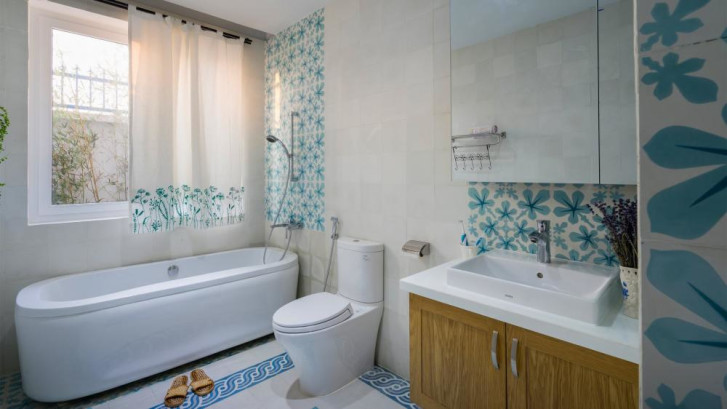 Những viên gạch và bộ rèm có họa tiết màu xanh biển tạo cảm giác thư giãn cho gia chủ.