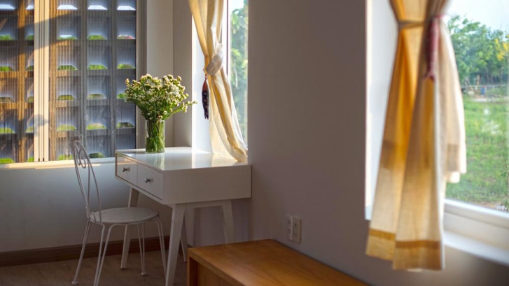 Từng chi tiết nhỏ như gạch ốp sàn hay rèm cửa đều toát lên sự tinh tế và đồng điệu.