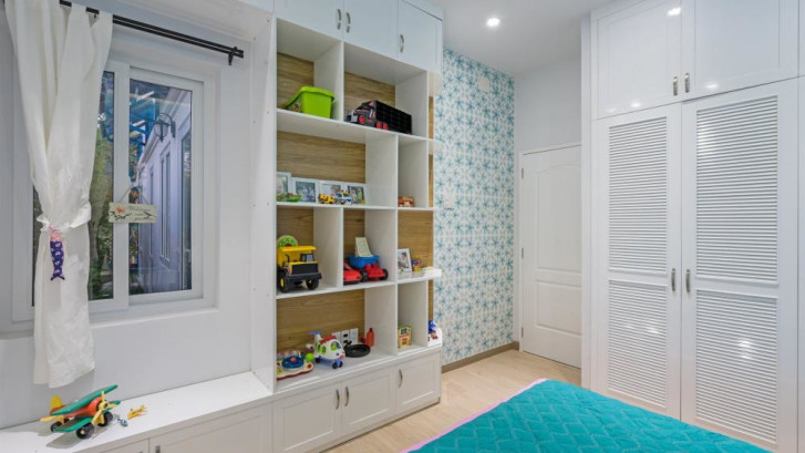 Tại đây có hệ tủ, kệ lớn để bé cất giữ đồ chơi.