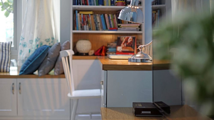 Góc làm việc nhỏ xinh, tích hợp kệ sách với nhiều không gian lưu trữ.