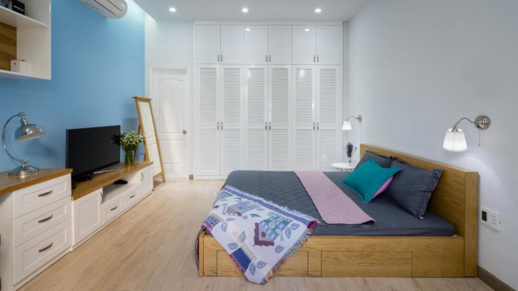 Việc sử dụng nội thất màu trắng giúp căn phòng không bị nặng nề. Hệ tủ âm tường và ngăn kéo ẩn dưới giường góp phần tăng khả năng lưu trữ cho phòng ngủ. Do vậy, dù gia chủ có rất nhiều đồ nhưng căn phòng vẫn gọn gàng mà không bị quá tải.