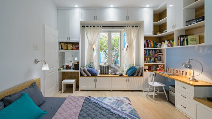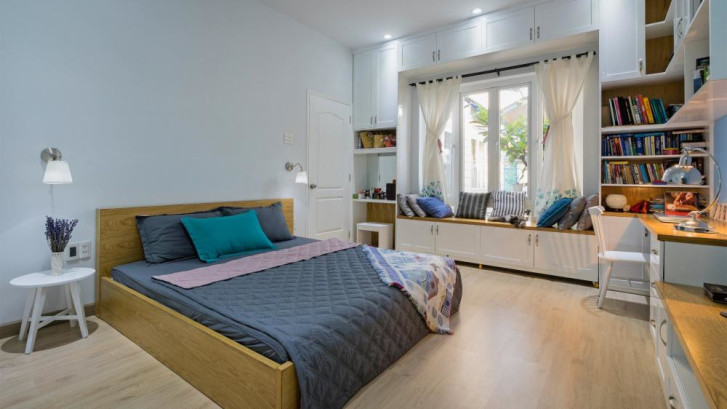 Hệ tủ, ngăn kéo xuất hiện ở khắp mọi nơi giúp gia tăng khả năng lưu trữ cho không gian.Bục windows bố trí ngay cửa sổ lớn, là góc thư giãn tuyệt vời.