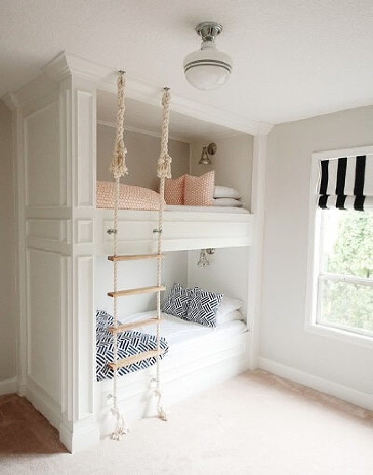 Sáng tạo một chút với cầu thang dây giành cho các bé có phần mạo hiểm. Thế nhưng để tránh té ngã, ba mẹ hãy chọn loại thang dây được gắn ốc vít liền với thân giường để đảm bảo chúng không nghiêng ngả nhiều quá nhé!