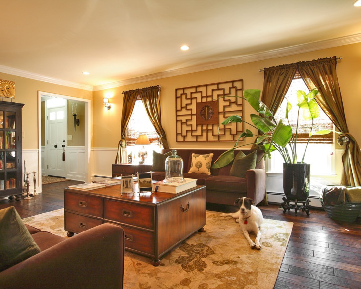 Phong cách thiết kế Á Đông đặc trưng bởi nét không gian sạch sẽ, gọn gàng và có sự liên kết chặt chẽ với không gian nội thất. Khi lựa chọn phong cách này để thiết kế phòng khách cần chọn một chủ đề chính vì phong cách Á Đông với đặc trưng là nét thanh bình, sự bình lặng sẽ không phù hợp với các yếu tố mang tính cá nhân ngẫu hứng hoặc màu sắc đồ dùng có sự tương phản mạnh, do đó hãy đơn giản và đừng rườm rà. Hãy chú ý đến điều này vì nó đóng vai trò quan trọng trong tư duy thiết kế của gia chủ, thông qua công trình kiến trúc của người châu Á hoàn toàn có thể đánh giá được về gia chủ của căn nhà.