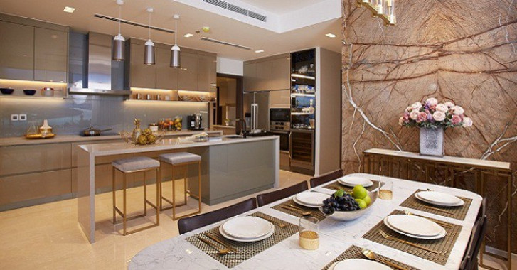 Phòng bếp ấm áp với nội thất hiện đại của căn hộ 4 phòng ngủ tại nhà mẫu Q2 THAO DIEN