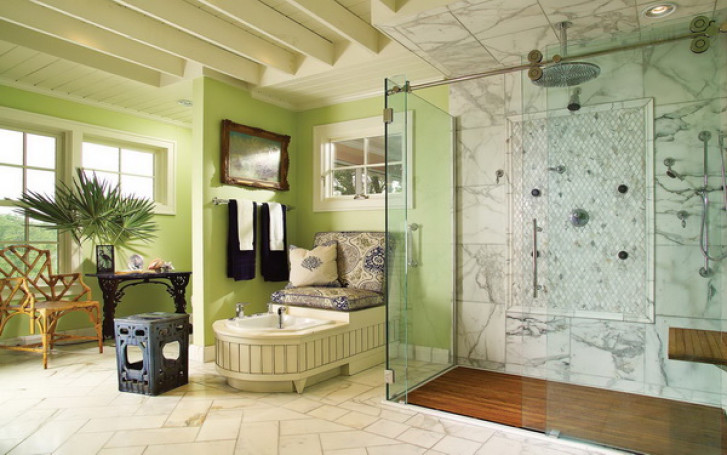 Phòng tắm Retro sang trọng với phần tường ốp đá cẩm thạch xanh và sàn gỗ. Đồ đạc trong phòng nhiều kiểu dáng khác nhau tạo nên sự đa dạng và tiện nghi