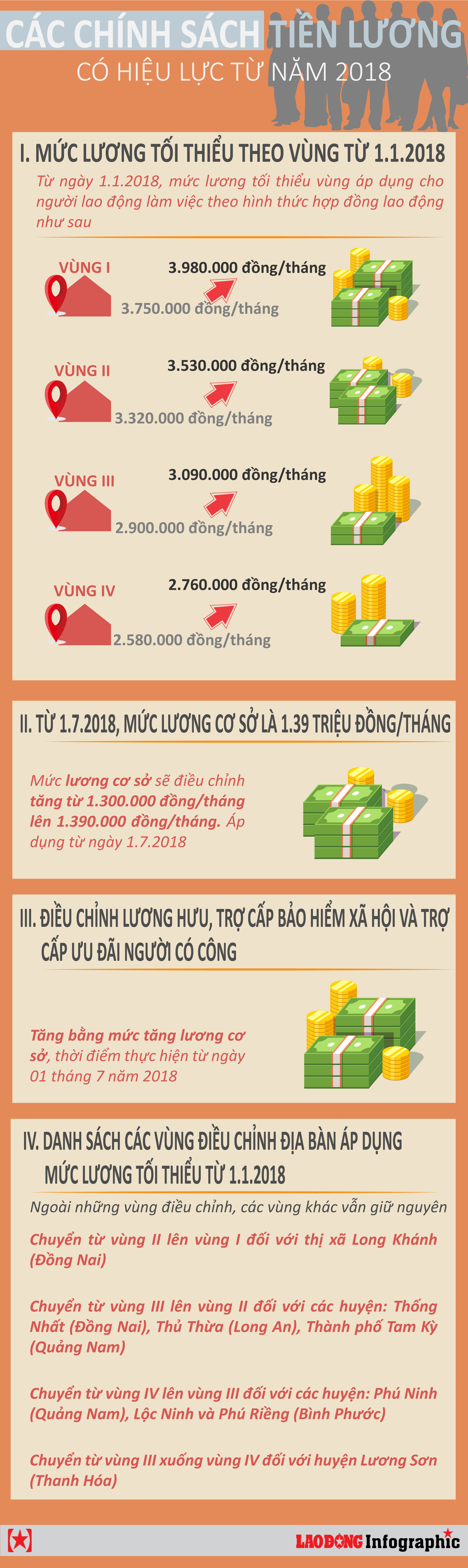 Sang năm 2018: Lương tối thiểu vùng tăng thêm bình quân 6,5%; lương cơ sở tăng từ 1.300.000 đồng/tháng lên 1.390.000 đồng/tháng.