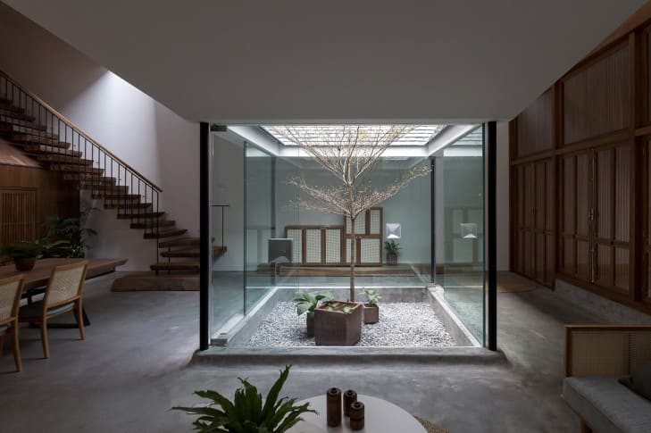 Khối kính bao bọc phần thông tầng giữa với sắp đặt là một cây bàng Đài loan tán rất gợi về Phom với phần phễu, một khuôn vườn nhỏ có chất Zen giữa nhà, đồng thời đây cũng là yếu tố phân chia không gian trong toàn bộ chức năng tầng 1. Vị trí lệch của Phễu trên mặt bằng phân chia lối đi chính tới thang, kiến tạo phần không gian phòng khách và phần bàn ăn xung quanh 4 mặt kính.