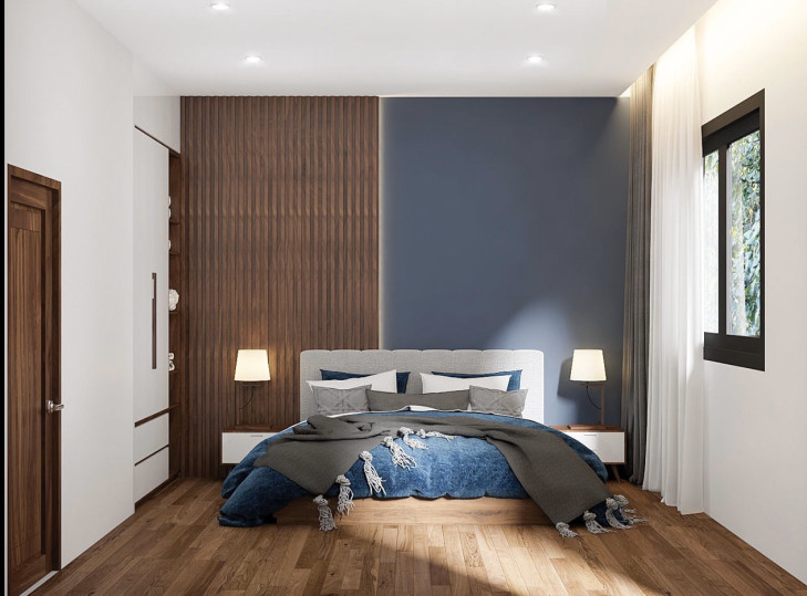 Phòng ngủ master được thiết kế với hai tông màu chính là trắng và nâu gỗ. Màu trắng của tường và trần tạo cảm giác rộng rãi, nhẹ nhàng. Gỗ walnut sậm màu vừa tạo điểm nhấn cho không gian lại mang lại sự ấm cúng và sang trọng.
