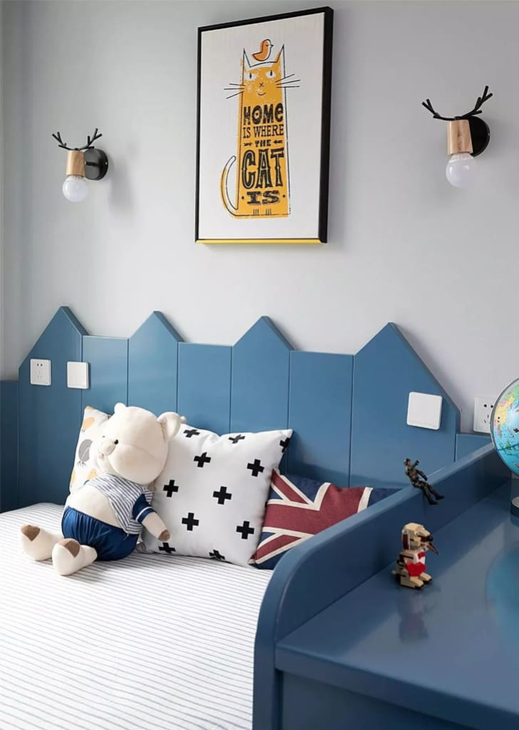 Phòng ngủ của cậu con trai được thiết kế giường kết hợp hệ tủ với màu xanh bắt mắt, tươi sáng và vui nhộn. Bức tranh treo tường màu vàng sáng với hình ảnh chú chó ngộ nghĩnh tăng thêm nét “động” cho không gian tĩnh.