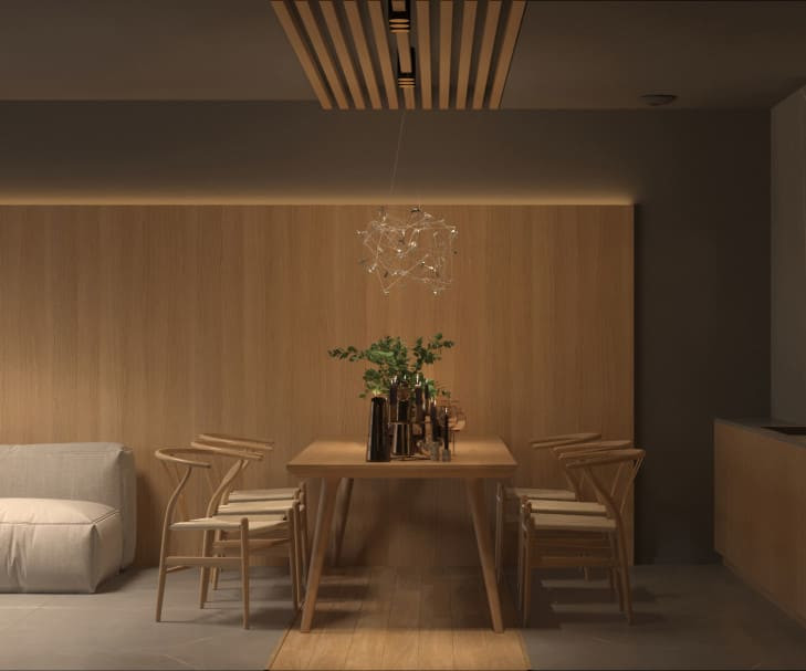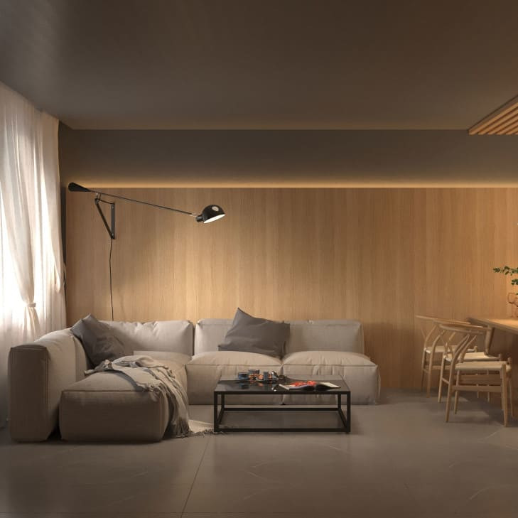 Ánh sáng của đèn chu vi LED trắng ấm áp phả xuống toàn bộ bức tường gỗ, sự mờ ảo tỏa ra không gian phòng và dường như "thêm" cho căn phòng một tông màu vàng ấm cúng.