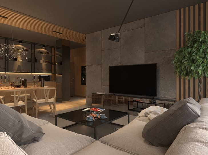 Căn phòng có thêm điểm nhấn bởi những mảng tường bê tông, lớp sơn xám trải dài trên trần nhà phù hợp với tông màu gỗ ấm cúng và đồ nội thất. Màu sắc đồ nội thất điểm tô cho không gian thêm hoàn hảo. Một cái bàn cà phê màu đen được thêm vào giúp tạo cảm giác “cân bằng” với TV màu đen trong phòng khách.