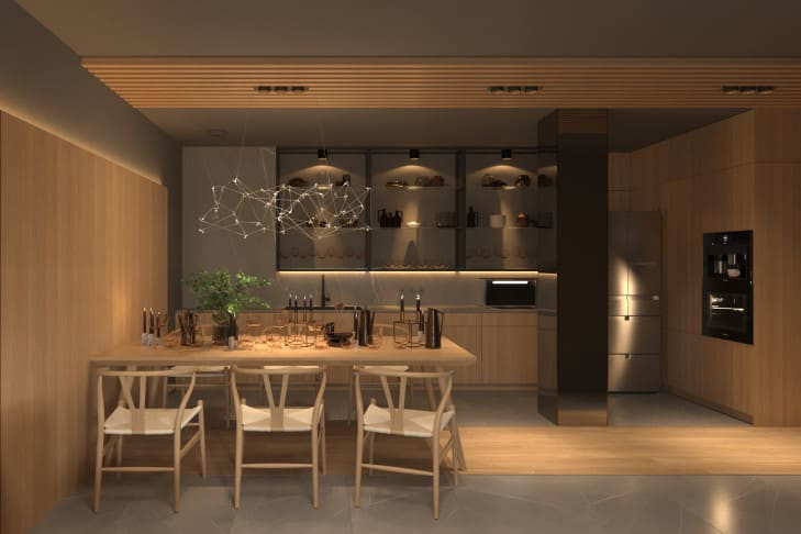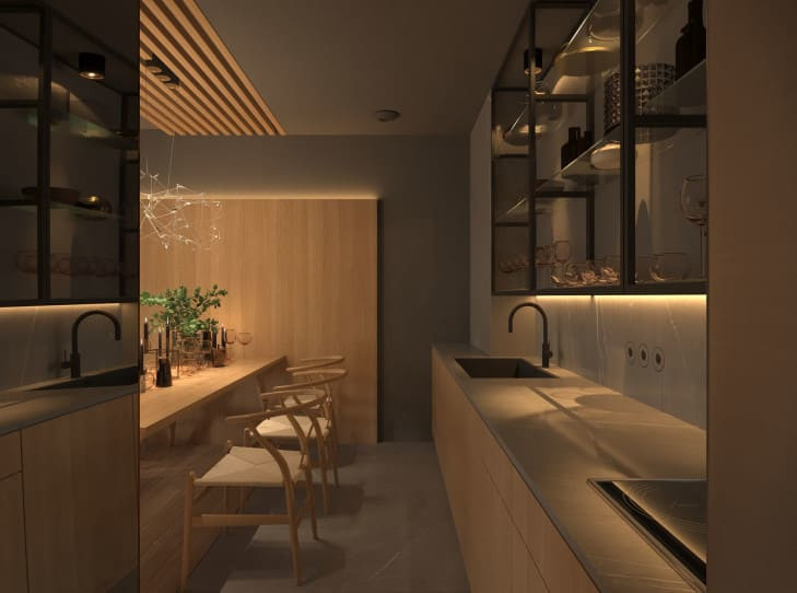 Căn bếp thiết kế hình chữ L, phần thứ hai bao bọc toàn gỗ và bố trí máy pha cà phê. Một trụ đứng bọc gương bốn phía để “ngụy trang” cho căn phòng và có vẻ như mọi người sẽ không nhận ra có một cái cột bằng gương ở đó.