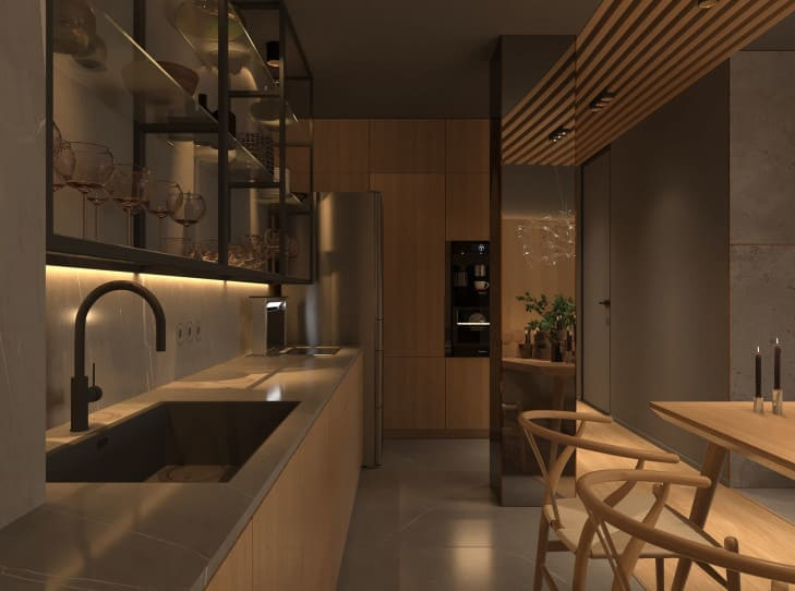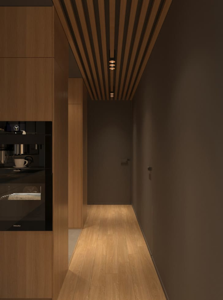 Khi bước vào ngôi nhà, ấn tượng đầu tiên chính là sự ấm áp của không gian sống. Kiến trúc sư Akhunov đã thiết kế một không gian sống có ánh sáng nhẹ nhàng phát ra từ các bờ cạnh của căn phòng. Tông màu gỗ nhẹ nhàng trên các bức tường giúp không gian nội thất trở nên yên tĩnh, ấm cúng hơn. Trần nhà được điểm xuyết những thanh gỗ dài làm điểm nhấn cho căn phòng. Đồ nội thất mềm mại với tông màu be và xám phù hợp với tông màu gỗ sáng và bê tông trong phòng.