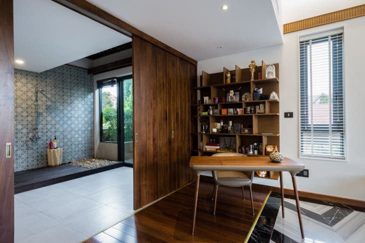 Phòng thờ – tâm linh được bố trí ở tầng áp mái, dành cho bố mẹ những lúc sang thăm con trai. Một góc thiền thật hiện đại và đơn giản nhưng vẫn đủ nghiêm trang. Một dấu hiệu nữa về tính cá nhân trong căn biệt thự, đó là sự không bó buộc trong lựa chọn nội thất. Việc phối hợp có phần ngẫu hứng của đồ cổ, nội thất hiện đại, đồ sắt cho đến gỗ chạm kết hợp mặt đá cho đảo bếp… đã trở thành điểm đặc trưng cho không gian nội thất.