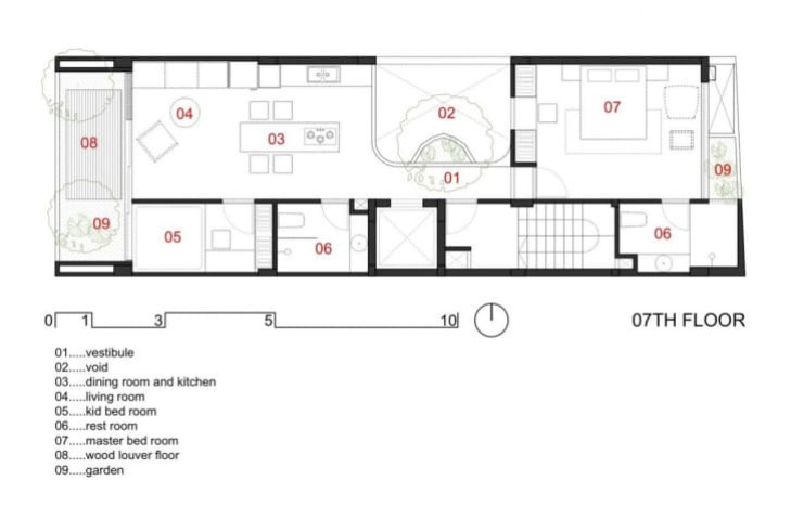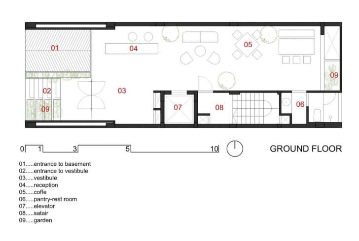 •Tất cả không gian được gắn kết bằng lõi thang máy và thang bộ tại vị trí trung tâm toà nhà. Kết hợp thêm vào đó là giếng trời thông gió và đón ánh sáng tự nhiên trên cao.