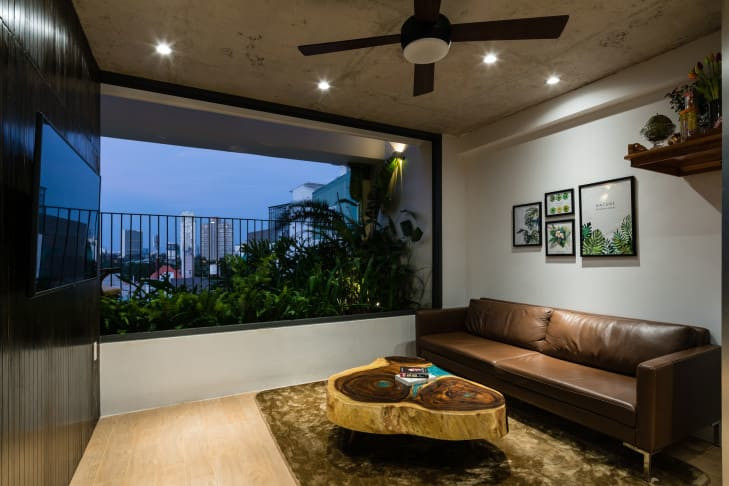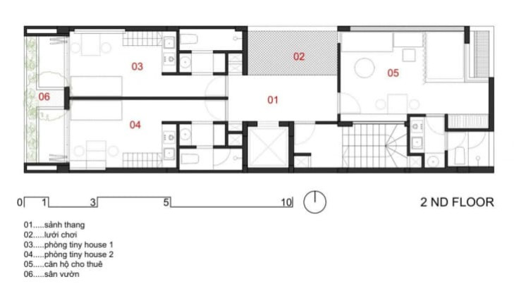 Trong không gian giếng trời có các thang sắt kết nối giữa căn tiny house và căn thường (do lệch tầng). Các thang này kết thúc bằng một bồn cây treo ở vị trí căn penthouse tạo điểm nhấn (spot light).