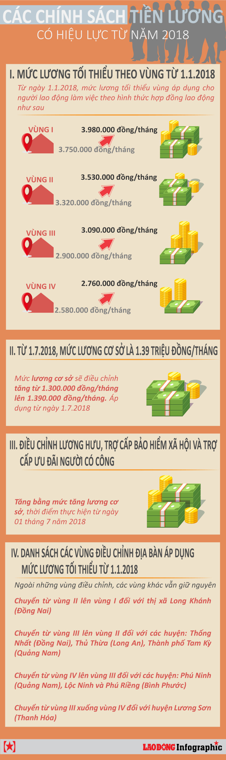 Sang năm 2018: Lương tối thiểu vùng tăng thêm bình quân 6,5%; lương cơ sở tăng từ 1.300.000 đồng/tháng lên 1.390.000 đồng/tháng. Các chính sách lương hưu và trợ cấp được tăng theo tuỳ nhóm đối tượng.