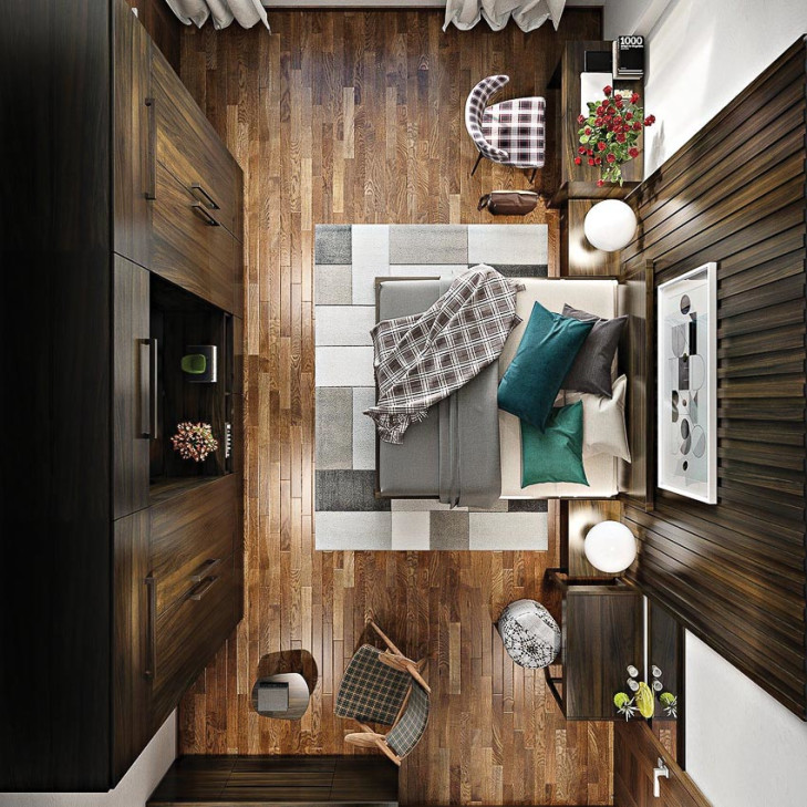 Trần của căn phòng rất bắt mắt nhờ sự đa dạng của các tông màu gỗ khác nhau: đen, nâu đen, vàng,… Chiếc giường và tấm thảm tạo điểm nhấn – như một ốc đảo trung tâm, đem đến sự thư giãn.