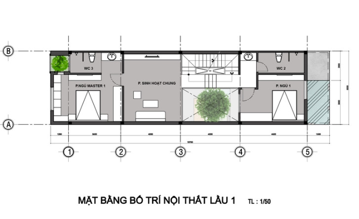 Ngôi nhà có tổng chiều dài 20m, tầng trệt được thiết kế đầy đủ công năng gồm khu vực Gara, phòng khách, hồ cá Koi kết hợp với cây xanh lớn giữa nhà tạo mảng xanh cho toàn bộ căn nhà 3 tầng, phòng ăn kết hợp với bếp tiếp giáp không gian xanh giữa nhà và sân vườn sau, sau cùng của nhà là 1 vệ sinh nhỏ với thiết kế lavabo bên ngoài.