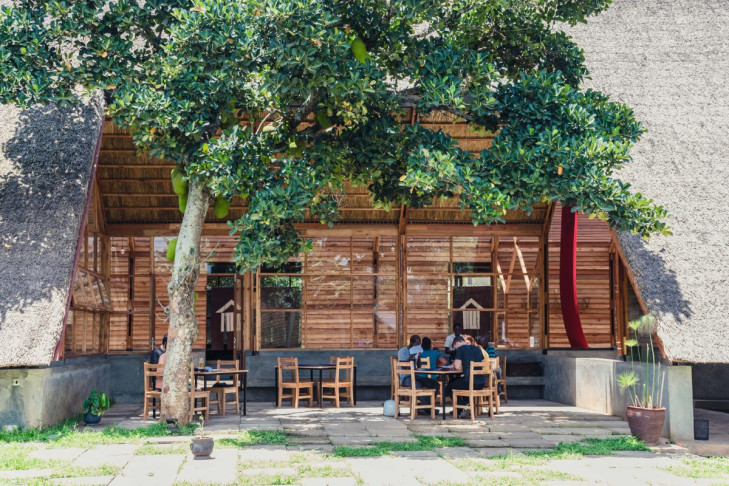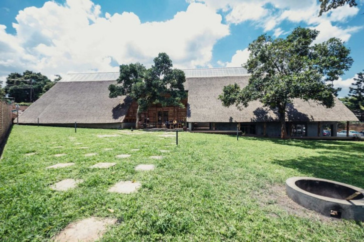 Ngôi nhà thương mại được thiết kế với mái nhà tranh lớn, xây dựng trên khu đất dốc nhẹ.