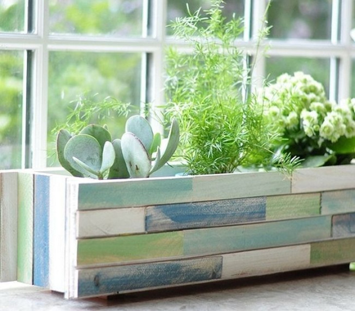 Sử dụng những mảnh ghép để tạo nên một chiếc hộp trồng cây “độc nhất vô nhị”. Đây là một ý tưởng sáng tạo lại dễ làm mà gia chủ có thể thực hiện ngay lập tức, bằng cách mua một chiếc hộp trồng cây. Sau đó, tạo dấu ấn riêng bằng việc dán những mảnh gỗ đều nhau ở bên ngoài chiếc hộp và sơn màu ngẫu nhiên. Có thể trồng hoa hoặc các loại cây gia vị xanh mát, chắc chắn vẻ ngoài khung cửa sổ sẽ sống động hơn nhiều.